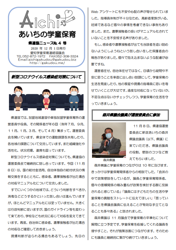 コロナ禍において、学童保育の運営(補助金等を含め)や保育内容、子ども・保護者・指導員同士の関係のあり方等、さまざまな問題が浮き彫りになってきています。