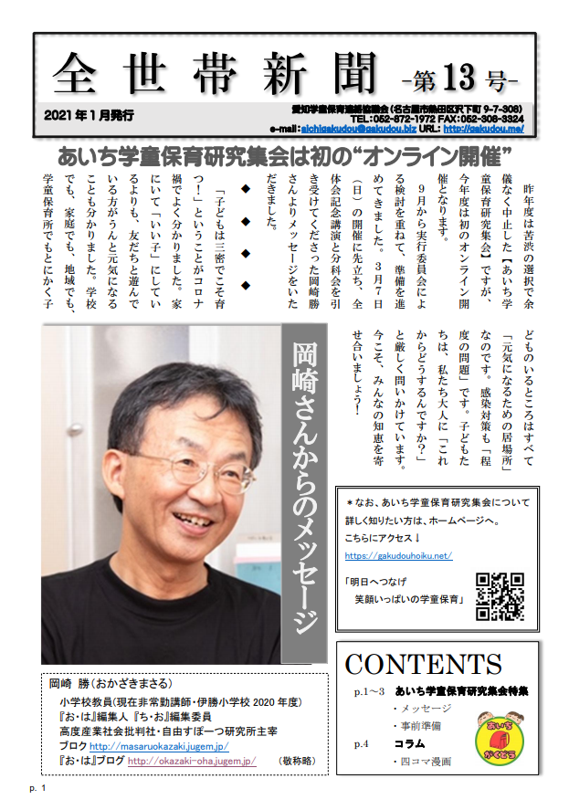 学童保育カンファレンスルームより、秋の企画のお知らせが届きましたので、ご案内します。学童保育カンファレンスルーム秋の企画 オンライン講演会で、全国研やあいち学童保育研究集会でのお馴染みの高垣先生のお話が聞けます。お近くの皆さんにもお知らせください。