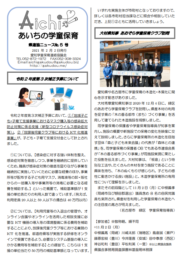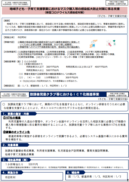 二次補正予算については、第2波も考慮し、早急に活用されるとよい補助事業となるため、市町村へ確認を急ぎましょう。県連協ニュースのバックナンバーは→こちら