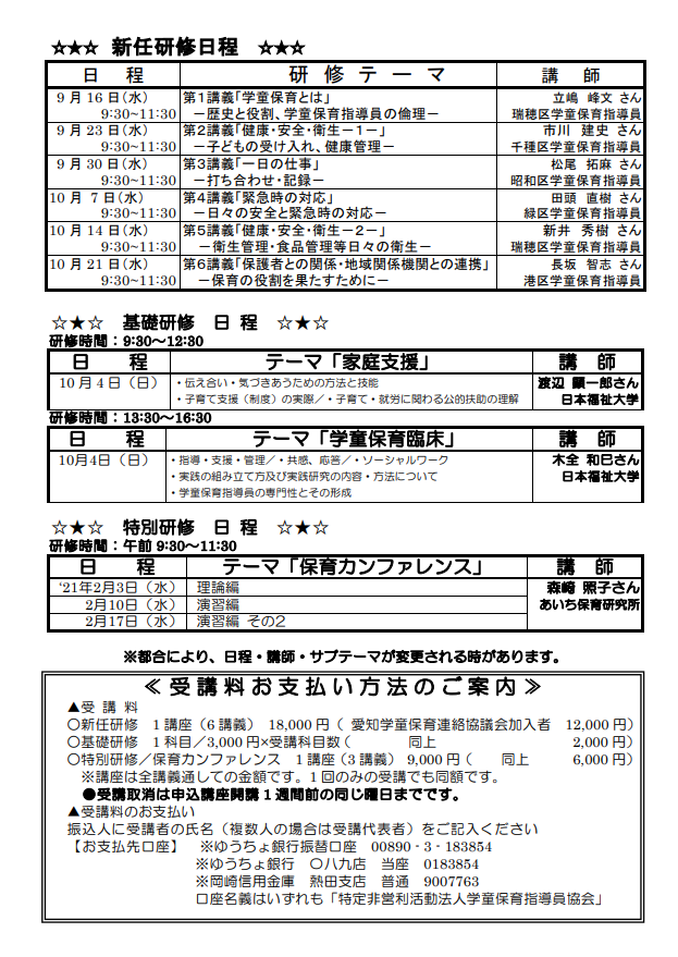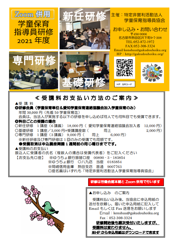 2020年度はコロナの影響もあり、研修の機会がかなり減りました。2021年度は、研修の種類も増え、また新しい受講料のプランも準備されています。詳しくは、学童保育指導員協会のぺージへ