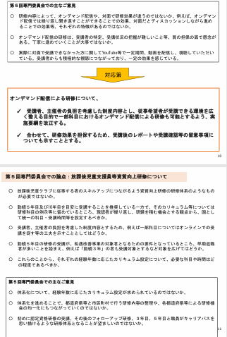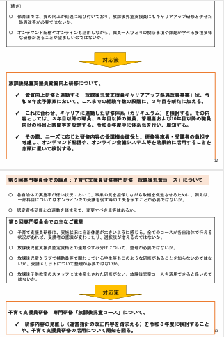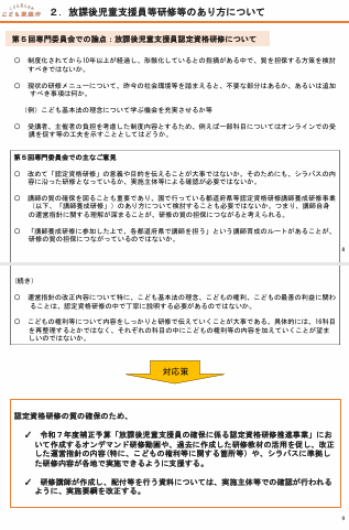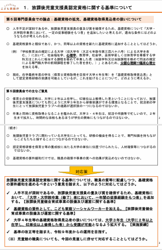 「放課後児童クラブの諸課題への対応案」が示され、まず放課後児童支援員の基礎資格や研修制度の見直しが説明されました。大学三年生から研修受講を可能にする案や、子ども家庭ソーシャルワーカーを基礎資格に追加する案など、人材確保と質の向上を両立させるための改正点が提示されました。また、研修の質を担保するため、オンデマンド教材の活用や講師資料の確認体制の整備なども盛り込まれました。